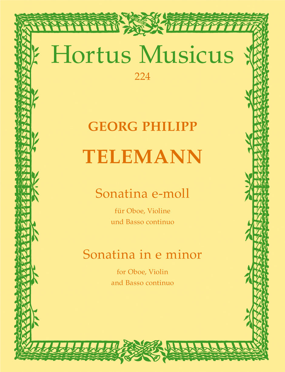 **Title**: Sonatina für Oboe, Violine (Diskantgambe) und Basso continuo e-Moll TWV 42:e5 | **Composer / Author**: Telemann, Georg Philipp | **Editor**: Hofmann, Klaus | **Edition Type**: Performance score, Set of parts | **Scoring/ Instrumentation**: Oboe, Violin, Basso continuo | **Binding**: Stapled | **Level of Difficulty**: 2.0 | **Weight**: 70.0 g | **Format**: 28,9 x 21,0 cm | **Pages**: 10/2/2/2 S. | **Language**: EN | Sample: https://data.baerenreiter.com/NB/HM/HM00224_00_9790006004492_nb_lrg_01.jpg