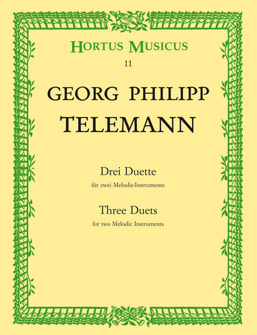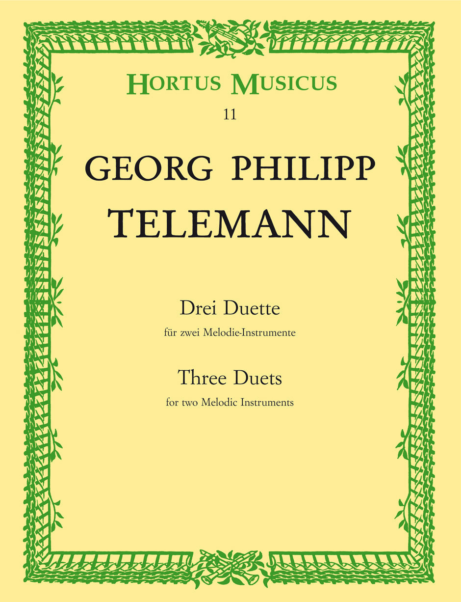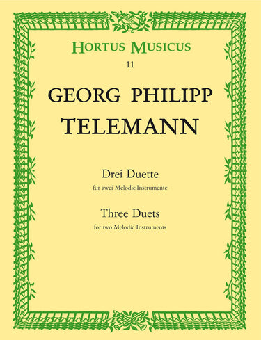 **Title**: Three Duets for two Melodic Instruments in B-flat major, D major, G major | **Misc Information**: from "Der getreue Musikmeister" | **Composer / Author**: Telemann, Georg Philipp | **Editor**: Degen, Johannes Dietz | **Edition Type**: Performance score, Anthology | **Scoring/ Instrumentation**: Treble recorders (2), Violin, Flute | **Binding**: Stapled | **Level of Difficulty**: 3.0 | **Printing**: 17th printing 2021 | **Weight**: 97.0 g | **Format**: 30,0 x 23,0 cm | **Pages**: IV, 20 S. | **Language**: EN | Sample: https://data.baerenreiter.com/NB/HM/HM00011_00_9790006000135_nb_lrg_01.jpg