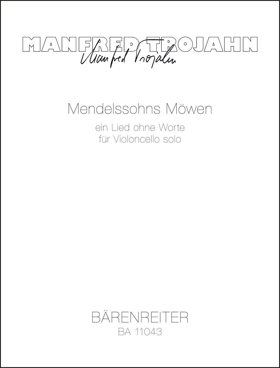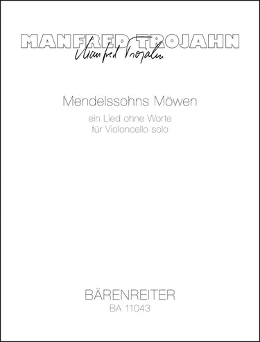 **Title**: Mendelssohns Möwen (2012) | **Subtitle**: A Song without Words for Violoncello Solo | **Composer / Author**: Trojahn, Manfred | **Edition Type**: Performance score | **Instrumentation**: Violoncello | **Scoring/ Instrumentation**: Violoncello | **Binding**: Stapled | **Level of Difficulty**: 5.0 | **Duration**: 00:05:30 | **Printing**: 2nd printing 2013 | **Weight**: 53.0 g | **Format**: 33,5 x 25,5 cm | **Pages**: 4 S. | **Language**: EN | Sample: https://data.baerenreiter.com/NB/BA/BA11043_00_9790006543229_nb_lrg_01.jpg
