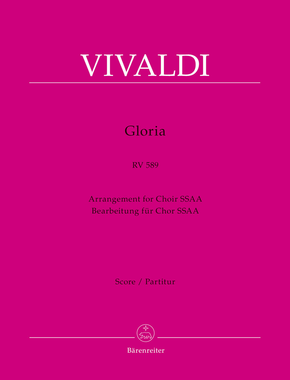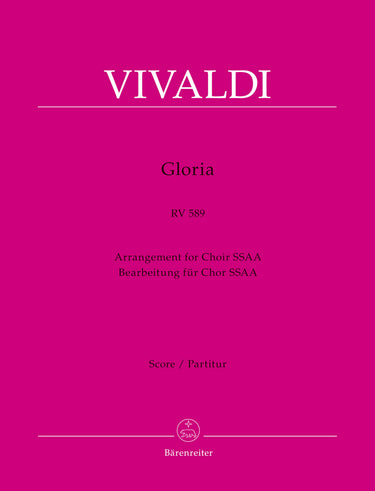**Title**: Gloria RV 589 | **Arranged for**: Arrangement for Choir SSAA | **Composer / Author**: Vivaldi, Antonio | **Editor**: Bruno, Malcolm | **Preface**: Bruno, Malcolm | **Edition Type**: Score | **Scoring/ Instrumentation**: Soprano solo (2), Alto solo, Female choir: SSAA, Orchestra | **Binding**: Stapled | **Printing**: 4th printing 2021 | **Language of Text Part**: Latin | **Weight**: 251.0 g | **Format**: 31,0 x 24,3 cm | **Pages**: VI, 49 S. | **Language**: EN | Sample: https://data.baerenreiter.com/NB/BA/BA08953_00_9790006541669_nb_lrg_01.jpg