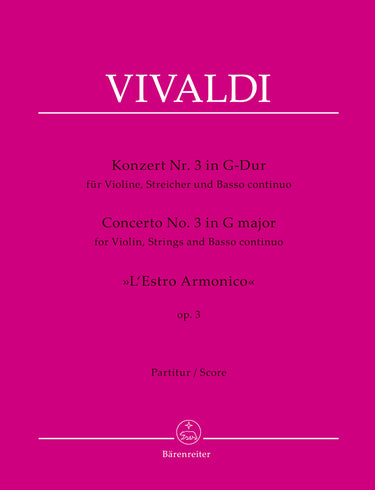 **Title**: Concerto III G-Dur op. 3 RV 310 | **Misc Information**: aus "L'Estro armonico" op. 3 | **Composer / Author**: Vivaldi, Antonio | **Editor**: Upmeyer, Walter | **Edition Type**: Score | **Scoring/ Instrumentation**: Violin, String orchestra | **Binding**: Stapled | **Duration**: 00:06:00 | **Printing**: 3. Aufl. 2018 | **Weight**: 129.0 g | **Format**: 31,0 x 24,3 cm | **Pages**: 23 S. | **Language**: EN | Sample: https://data.baerenreiter.com/NB/BA/BA03808_00_9790006439911_nb_lrg_01.jpg