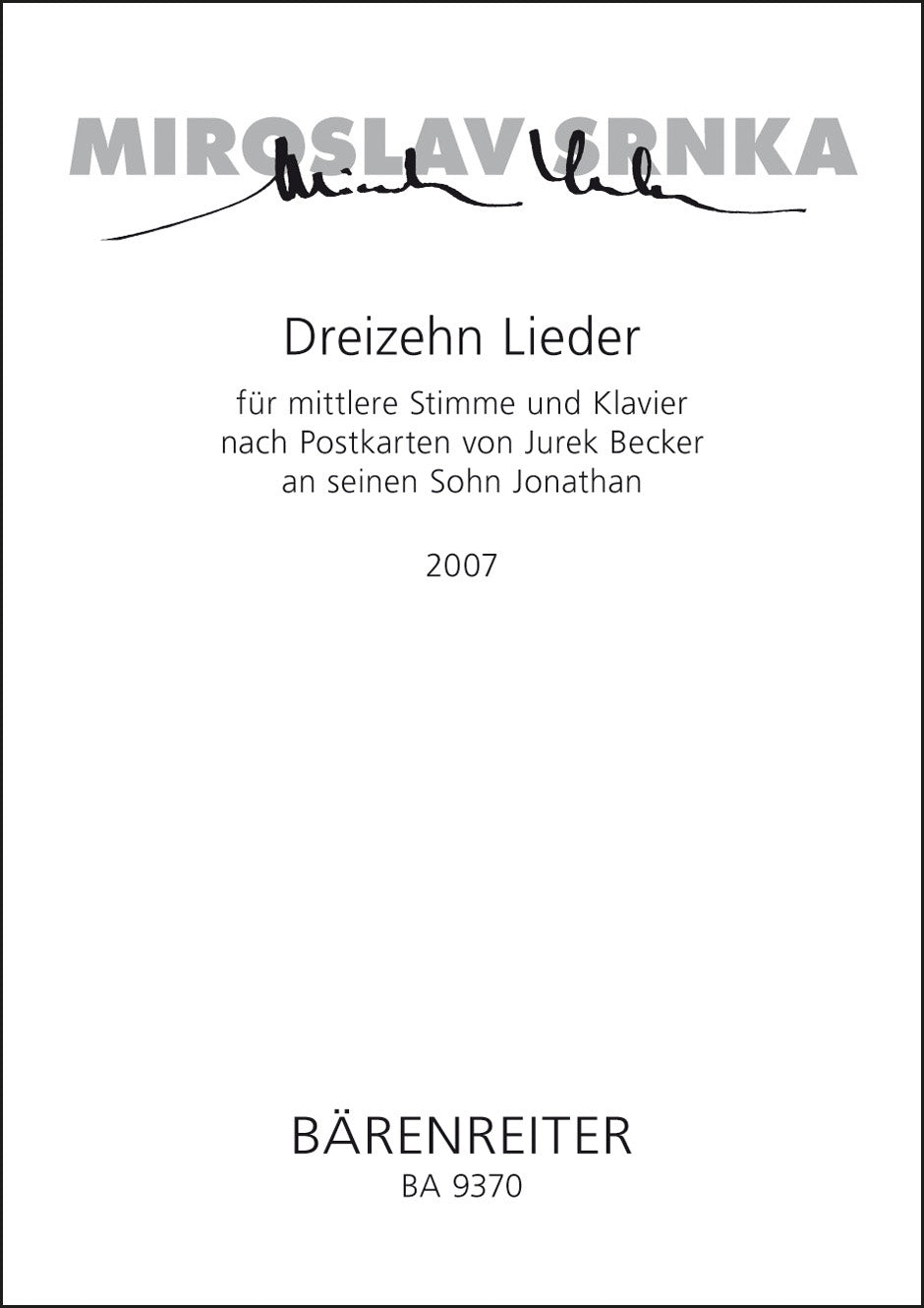 **Title**: Dreizehn Lieder for medium voice and piano (2007) | **Misc Information**: nach Postkarten von Jurek Becker an seinen Sohn Jonathan | **Comments**: World Premiere 31/10/2008, Kassel | **Composer / Author**: Srnka, Miroslav | **Edition Type**: Singing Score | **Scoring/ Instrumentation**: Medium voice, Piano | **Binding**: Stapled | **Duration**: 00:10:00 | **Printing**: 1. Aufl. 2009 | **Weight**: 144.0 g | **Format**: 29,6 x 21,0 cm | **Pages**: 35 S. | **Language**: EN | Sample: https://data.baerenreiter.com/NB/BA/BA09370_00_9790006537334_nb_lrg_01.jpg