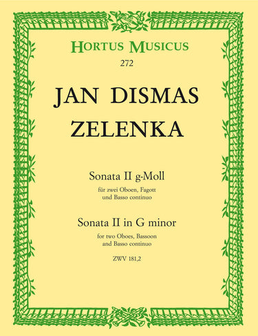 **Title**: Sonata II for two Oboes, Bassoon and Basso continuo in G minor ZWV 181,2 | **Comments on Version**: Continuo realization: Wolfgang Horn | **Composer / Author**: Zelenka, Jan Dismas | **Editor**: Reich, Wolfgang | **Edition Type**: Performance score, Set of parts | **Scoring/ Instrumentation**: Oboes (2), Bassoon, Basso continuo | **Binding**: Stapled | **Level of Difficulty**: 3.0 | **Printing**: 9th printing 2024 | **Weight**: 287.0 g | **Format**: 30,0 x 23,0 cm | **Pages**: 36/9/8/9/7 S. | **Language**: EN | Sample: https://data.baerenreiter.com/NB/HM/HM00272_00_9790006003754_nb_lrg_01.jpg