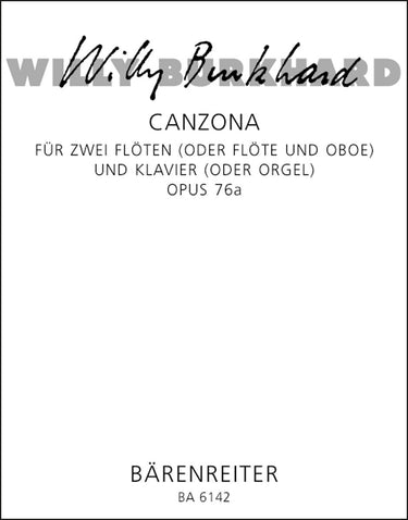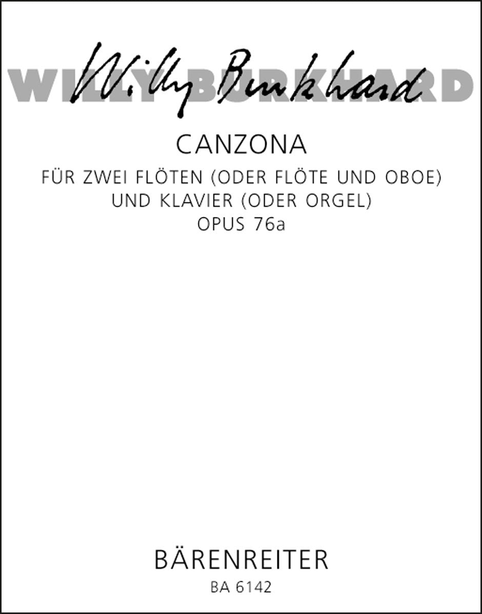 **Title**: Canzona op. 76a (1947) | **Composer / Author**: Burkhard, Willy | **Edition Type**: Score, Set of parts | **Scoring/ Instrumentation**: Flutes (2) (Flute, Oboe), Piano (Organ) | **Binding**: Stapled | **Level of Difficulty**: 4.0 | **Weight**: 96.0 g | **Format**: 30,0 x 23,0 cm | **Pages**: 10/4/3 S. | **Language**: EN | Sample: https://data.baerenreiter.com/NB/BA/BA06142_00_9790006476046_nb_lrg_01.jpg