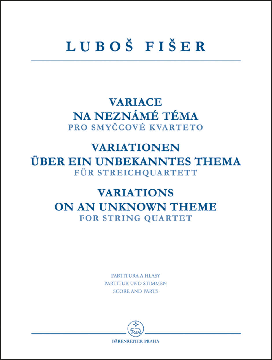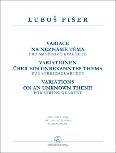 **Title**: Variations on an Unknown Theme for String Quartet | **Composer / Author**: Fišer, Luboš | **Editor**: Hájek, Jonáš | **Preface**: Hájek, Jonáš | **Edition Type**: Performance score, Set of parts | **Instrumentation**: String quartet | **Scoring/ Instrumentation**: Violins (2), Viola, Violoncello | **Binding**: Stapled | **Level of Difficulty**: 3.0 | **Weight**: 154.0 g | **Format**: 31,0 x 23,5 cm | **Pages**: IV, 11/4/4/4/4 S. | **Language**: EN | Sample: https://data.baerenreiter.com/NB/H/H08023_00_9790260105874_nb_lrg_01.jpg