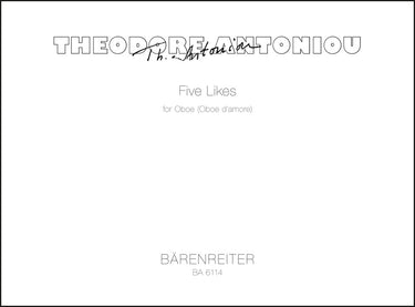 **Title**: Five Likes for Oboe solo (Oboe d'amore) (1969) | **Composer / Author**: Antoniou, Theodore | **Edition Type**: Performance score | **Instrumentation**: Oboe | **Scoring/ Instrumentation**: Oboe solo (Oboe d´amore solo) | **Binding**: Stapled | **Duration**: 00:24:00 | **Printing**: 7th printing 2016 | **Weight**: 63.0 g | **Format**: 24,0 x 29,5 cm | **Pages**: 11 S. | **Language**: EN | Sample: https://data.baerenreiter.com/NB/BA/BA06114_00_9790006475759_nb_lrg_01.jpg