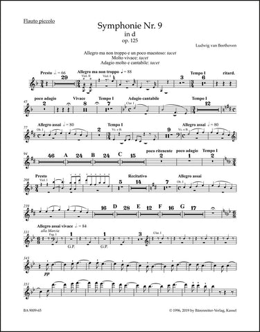**Title**: Symphony no. 9 in D minor op. 125 | **Comments on Version**: With final chorus "An die Freude" (Ode to Joy) | **Composer / Author**: Beethoven, Ludwig van | **Editor**: Del Mar, Jonathan | **Edition Type**: Wind set, Urtext edition | **Scoring/ Instrumentation**: Piccolo flute, Flutes (2), Oboes (2), Clarinets (2), Bassoons (2), Contrabassoon, Horns (4), Trumpets (2), Trombones (3), Timpani, Drums | **Binding**: Stapled | **Weight**: 1337.0 g | **Format**: 32,5 x 25,5 cm | **Pages**: 4x5/2x20/4x16/22/18/21/24/25/7/4x12/2x3/4 S. | **Language**: EN | Sample: https://data.baerenreiter.com/NB/BA/BA09009_65_9790006499526_nb_lrg_01.jpg