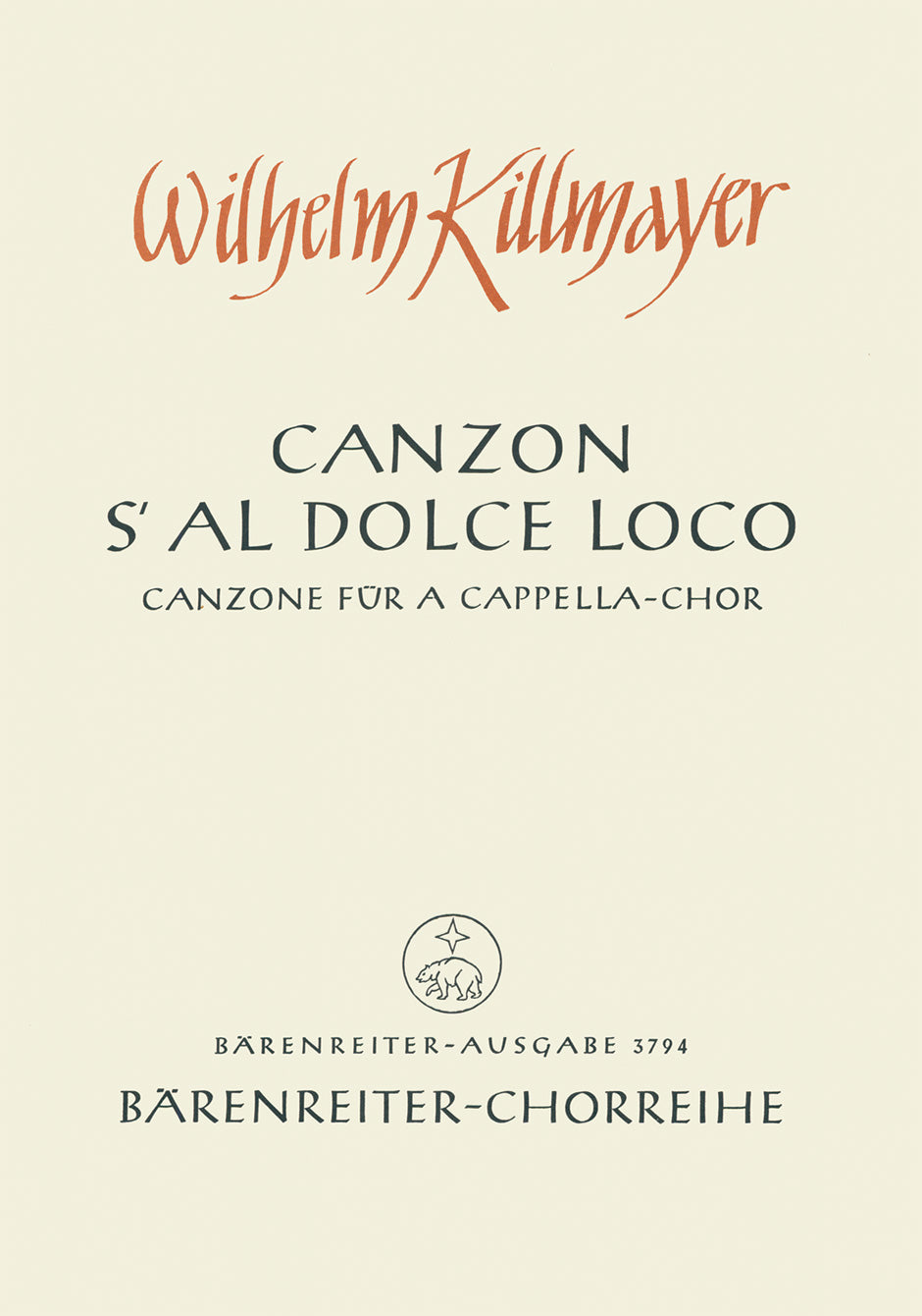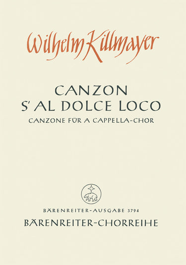 **Title**: Canzon, s'al dolce loco (1950) | **Subtitle**: Canzone nach einem Text von Francesco Petrarca (italienisch, deutsche Übersetzung beigegeben) | **Composer / Author**: Killmayer, Wilhelm | **Libretto/Text by**: Petrarca, Francesco | **Edition Type**: Choral score | **Instrumentation**: Choir | **Scoring/ Instrumentation**: Mixed choir (SATB) | **Binding**: Stapled | **Level of Difficulty**: 4.0 | **Language of Text Part**: Italian, German | **Weight**: 10.0 g | **Format**: 27,0 x 19,0 cm | **Pages**: 3 S. | **Language**: EN | Sample: https://data.baerenreiter.com/NB/BA/BA03794_00_9790006439782_nb_lrg_01.jpg