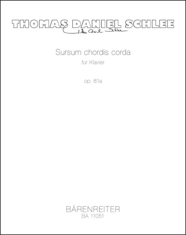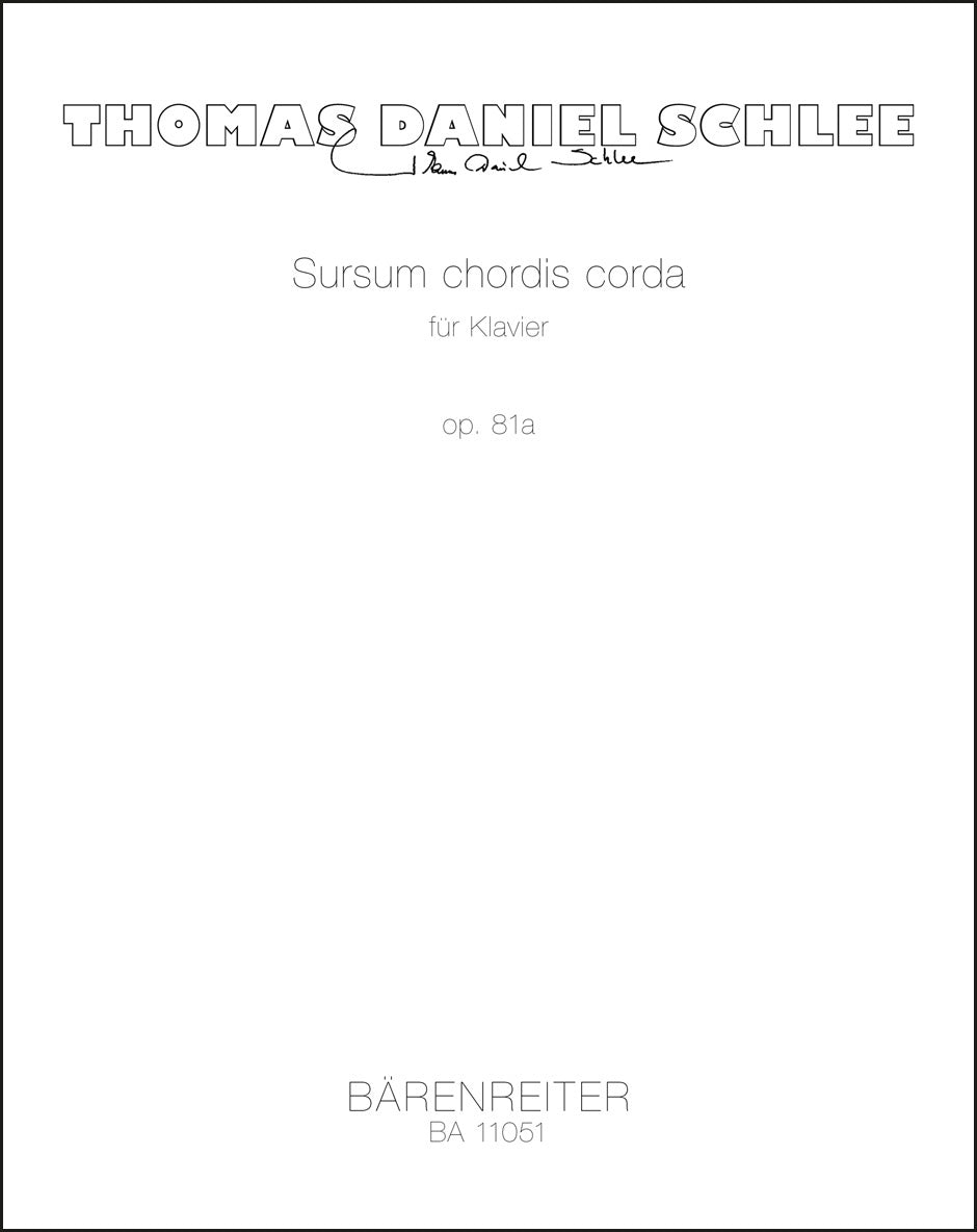**Title**: Sursum chordis corda for piano op. 81a | **Comments**: World Premiere 12/11/2013, Leverkusen | **Composer / Author**: Schlee, Thomas Daniel | **Edition Type**: Performance score | **Instrumentation**: Piano | **Scoring/ Instrumentation**: Piano | **Binding**: Stapled | **Duration**: 00:08:00 | **Printing**: 2nd printing 2020 | **Weight**: 120.0 g | **Format**: 34,0 x 27,0 cm | **Pages**: 15 S. | **Language**: EN | Sample: https://data.baerenreiter.com/NB/BA/BA11051_00_9790006525614_nb_lrg_01.jpg