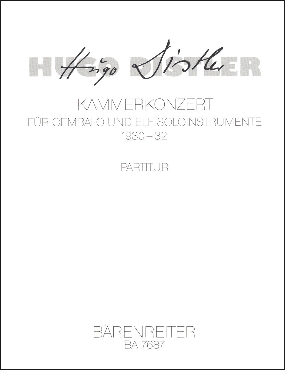 **Title**: Kammerkonzert (1930–1932) | **Subtitle**: Cembalo solo und 11 Soloinstrumente (Erstausgabe) | **Misc Information**: Cembalo-Konzert | **Composer / Author**: Distler, Hugo | **Editor**: Töpel, Michael | **Edition Type**: Study score | **Instrumentation**: Harpsichord, Orchestra | **Binding**: Stapled | **Duration**: 00:20:00 | **Weight**: 455.0 g | **Format**: 30,0 x 23,0 cm | **Pages**: 117 S. | **Language**: EN | Sample: https://data.baerenreiter.com/NB/BA/BA07687_22_9790006503568_nb_lrg_01.jpg