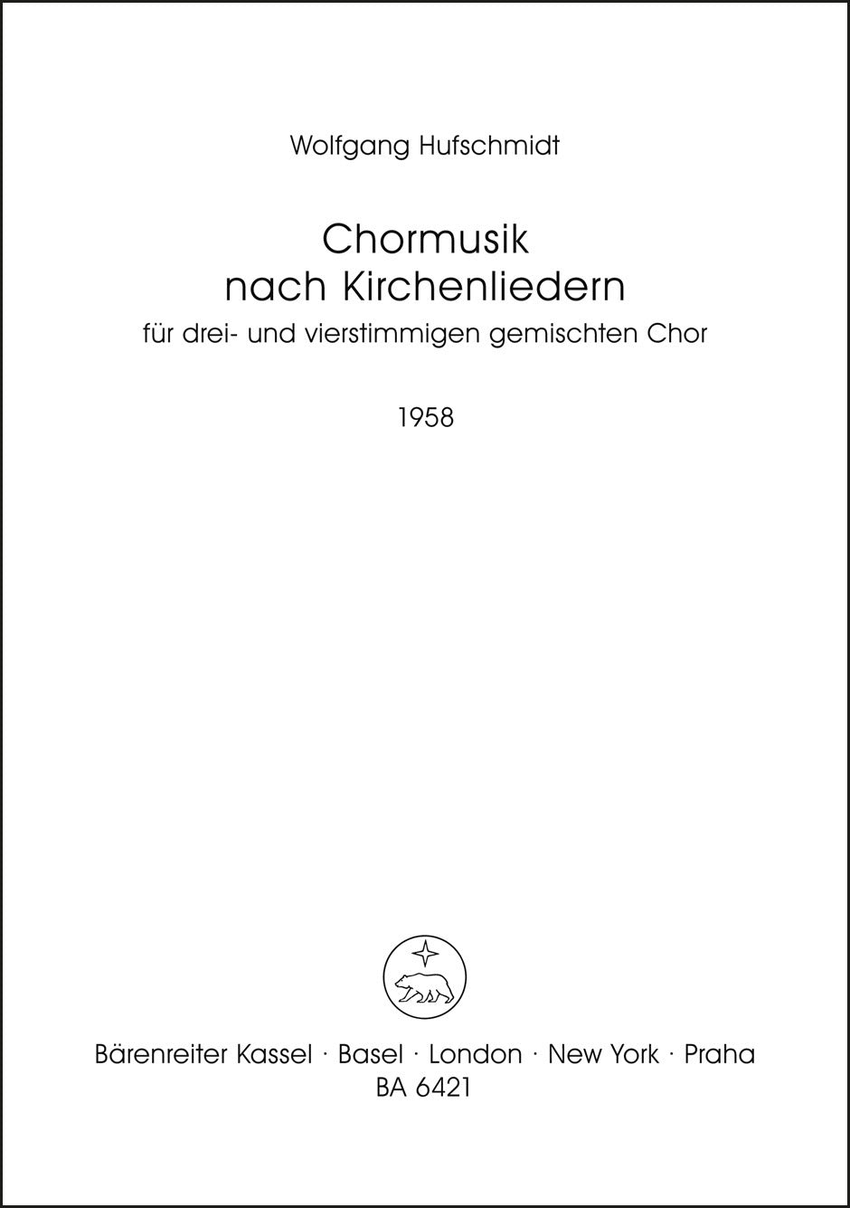 **Title**: Chormusik nach Kirchenliedern (1958) | **Subtitle**: 29 Cantus firmus-Bearbeitungen zu 19 Liedern | **Composer / Author**: Hufschmidt, Wolfgang | **Edition Type**: Choral score, Anthology | **Instrumentation**: Choir | **Scoring/ Instrumentation**: Mixed choir: SAMSt | **Binding**: Stapled | **Level of Difficulty**: 3.0 | **Weight**: 166.0 g | **Format**: 27,0 x 19,0 cm | **Pages**: 63 S. | **Language**: EN | Sample: https://data.baerenreiter.com/NB/BA/BA06421_00_9790006479382_nb_lrg_01.jpg