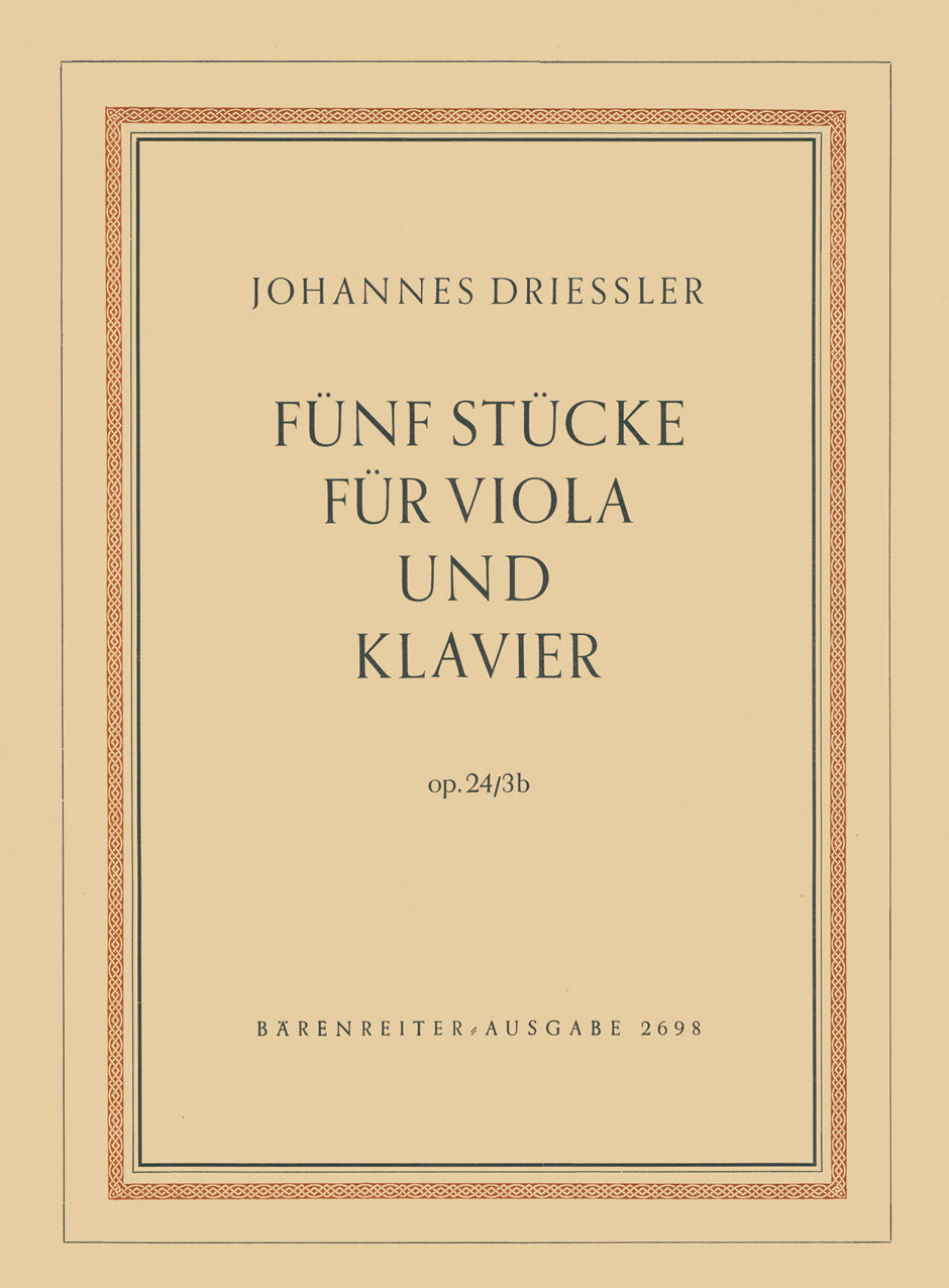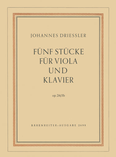 **Title**: Fünf Stücke für Viola und Klavier op. 24/3b (1952) | **Composer / Author**: Driessler, Johannes | **Edition Type**: Performance score, Part | **Instrumentation**: Viola, Piano | **Scoring/ Instrumentation**: Viola, Piano | **Weight**: 51.0 g | **Format**: 29,7 x 21,2 cm | **Pages**: 12/5 S. | **Language**: EN | Sample: https://data.baerenreiter.com/NB/BA/BA02698_00_9790006424931_nb_lrg_01.jpg