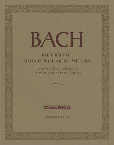**Title**: Bleib bei uns, denn es will Abend werden BWV 6 | **Subtitle**: Cantata for Easter Monday | **Composer / Author**: Bach, Johann Sebastian | **Editor**: Dürr, Alfred | **Edition Type**: Score, Urtext edition | **Scoring/ Instrumentation**: Vocal, Mixed choir, Orchestra | **Binding**: Stapled | **Level of Difficulty**: 3.0 | **Weight**: 190.0 g | **Format**: 32,5 x 25,5 cm | **Pages**: 24 S. | **Language**: EN | Sample: https://data.baerenreiter.com/NB/BA/BA10006_00_9790006489794_nb_lrg_01.jpg