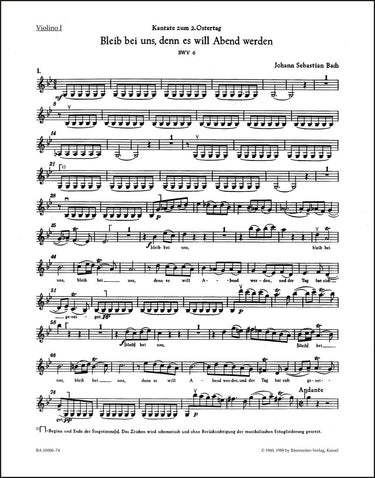 **Title**: Bleib bei uns, denn es will Abend werden BWV 6 | **Subtitle**: Cantata for Easter Monday | **Composer / Author**: Bach, Johann Sebastian | **Editor**: Dürr, Alfred | **Edition Type**: Part, Urtext edition | **Scoring/ Instrumentation**: 1. Violin | **Binding**: Folded | **Weight**: 15.0 g | **Format**: 32,5 x 25,5 cm | **Pages**: 4 S. | **Language**: EN | Sample: https://data.baerenreiter.com/NB/BA/BA10006_74_9790006489824_nb_lrg_01.jpg