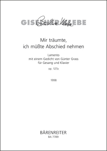 **Title**: Mir träumte, ich müsste Abschied nehmen op. 127a (1998) | **Subtitle**: Klavierfassung | **Misc Information**: Lamento mit einem Gedicht von Günter Grass für Gesang und Klavier | **Composer / Author**: Klebe, Giselher | **Edition Type**: Singing Score | **Instrumentation**: Vocal, Piano | **Scoring/ Instrumentation**: Vocal, Piano | **Binding**: Stapled | **Duration**: 00:18:00 | **Printing**: 2. Aufl. 2012 | **Weight**: 266.0 g | **Format**: 34,0 x 27,0 cm | **Pages**: 50 S. | **Language**: EN | Sample: https://data.baerenreiter.com/NB/BA/BA07789_00_9790006507016_nb_lrg_01.jpg