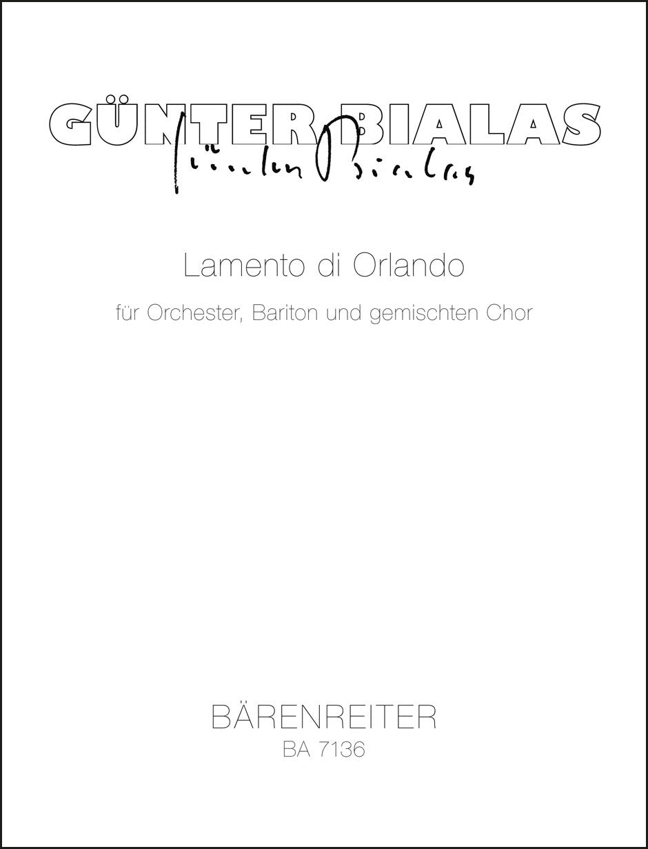**Title**: Lamento di Orlando für Orchester, Bariton und gemischten Chor (1985) | **Comments on Version**: Deutsche Texte aus "Siebenkäs" von Jean Paul (Bariton); lateinisch-italienischer Mischtext der Renaissance (Chor ad lib.) | **Composer / Author**: Bialas, Günter | **Edition Type**: Study score | **Instrumentation**: Soloists, Choir, Orchestra | **Binding**: Stapled | **Duration**: 00:28:00 | **Weight**: 243.0 g | **Format**: 27,5 x 20,8 cm | **Pages**: 76 S. | **Language**: EN | Sample: https://data.baerenreiter.com/NB/BA/BA07136_00_9790006485635_nb_lrg_01.jpg