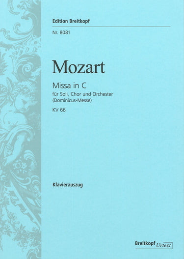 Missa in C K. 66 | Dominicus Mass | solos,mix ch,orch | solos: SATB – choir: SATB – 0.2.0.0. – 2.4.3.0. – timp – org – str | Choir | Chorus | Chorus (with soloists) and piano | 40' | Classical | Mass | Piano/Vocal Score | piano vocal score | Haverkampf, Ulrich | Obst, Michael (KA) | 124 | Softbound | 19 x 27 cm
