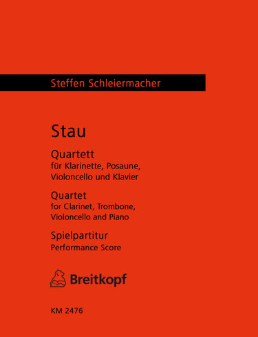 Stau | Quar | clar.tbne.vc.pno | Chamber music | Chamber music mixed | Piano Quartet | 1999 | 10' | Music post-1945 | New music (post-2000) | Sheet Music | performance score | | | 16 | stapled | 23 x 30,5 cm