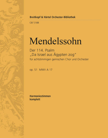 Psalm 114 Op. 51 MWV A 17 “Da Israel aus Ägypten zog” | Urtext | dble mix ch,orch | choir: SSAATTBB – 2.2.2.2. – 4.2.3.0. – timp – str | 14' | Romantic | Psalm | Sheet Music | wind parts | Riedel, Christian R. | | 120 | Folder | 23 x 30,5 cm
