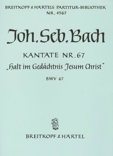 Cantata BWV 67 “Hold in remembrance Jesus Christ” | Quasimodogeniti [1st Sunday after Easter] | solos,mix ch,orch | solos: ATB – choir: SATB – 1.0.2ob d’am.0.0 – 0.1.0.0 – str – bc | Choir | Chorus | Chorus (with soloists) and orchestra | 15' | Baroque | Cantata | Sheet Music | full score | | | 32 | Softcover | 23 x 30,5 cm