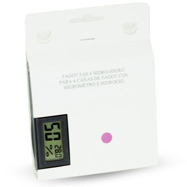 Plastic case for 4 canes of fagot. With 'hydrogel' & hygrometer. External size: 11x11x2cm.
