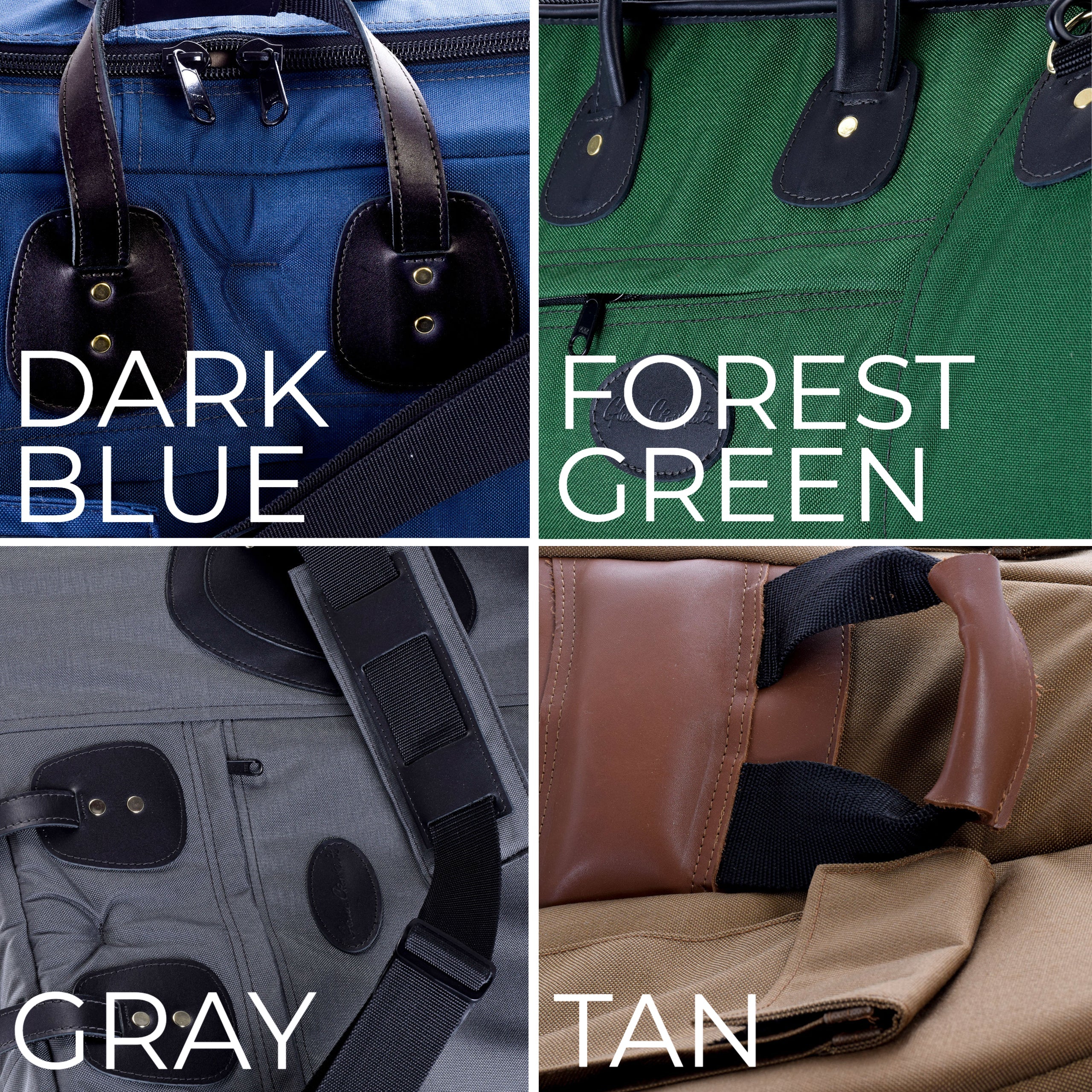 - 3 pounds 9 ounces in nylon or 5 pounds 10 ounces in leather (1.6 kilo nylon, 2.6 kilo leather), 33 inches long, 8 inches tall, 15 inches wide (83.8 x 20.3 x 38.1 cm). Flies EASY