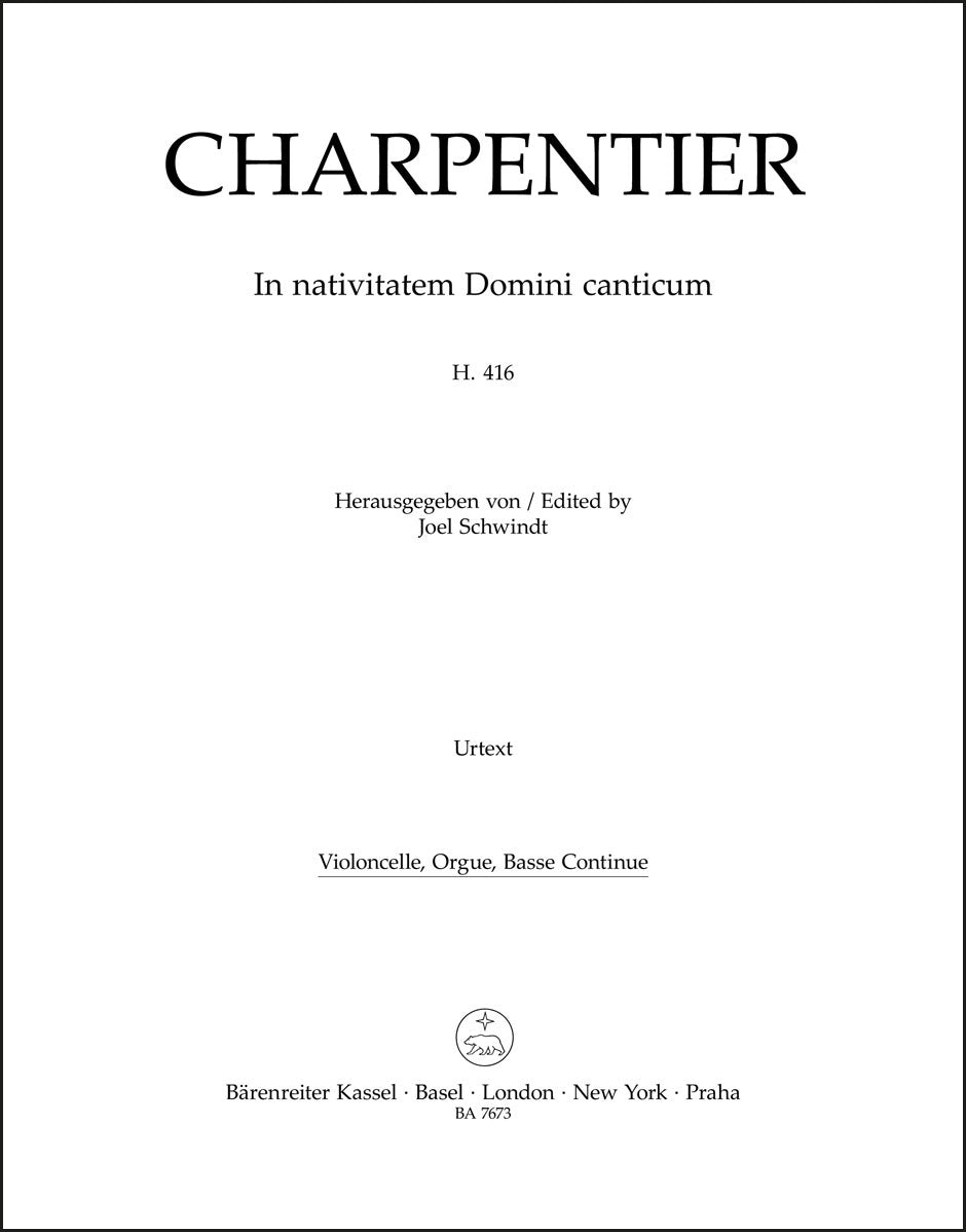 **Title**: In nativitatem Domini canticum H. 416 | **Composer / Author**: Charpentier, Marc-Antoine | **Editor**: Schwindt, Joel | **Edition Type**: Part, Urtext edition | **Scoring/ Instrumentation**: Violoncello, Organ, Basso continuo | **Binding**: Stapled | **Weight**: 67.0 g | **Format**: 32,5 x 25,5 cm | **Pages**: 13 S. | **Language**: EN | Sample: https://data.baerenreiter.com/NB/BA/BA07673_82_9790006540044_nb_lrg_01.jpg