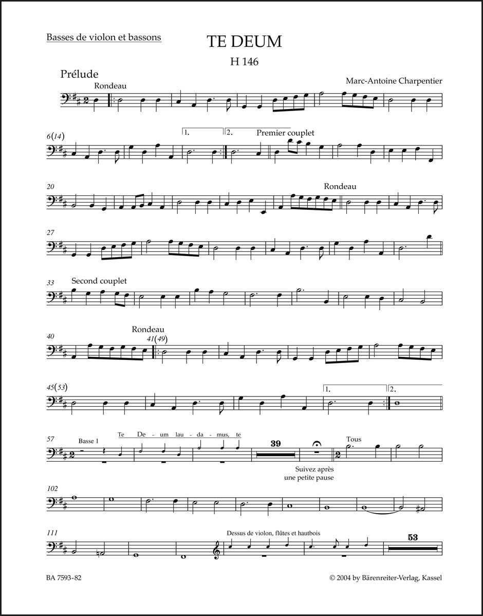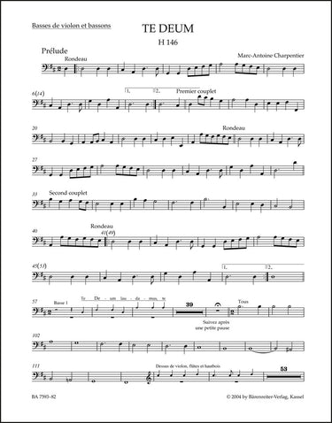 **Title**: Te Deum in D major H 146 | **Composer / Author**: Charpentier, Marc-Antoine | **Editor**: Schauerte-Maubouet, Helga | **Edition Type**: Part, Urtext edition | **Scoring/ Instrumentation**: Violoncello, Double bass | **Binding**: Stapled | **Weight**: 33.0 g | **Format**: 32,5 x 25,5 cm | **Pages**: 7 S. | **Language**: EN | Sample: https://data.baerenreiter.com/NB/BA/BA07593_82_9790006525423_nb_lrg_01.jpg