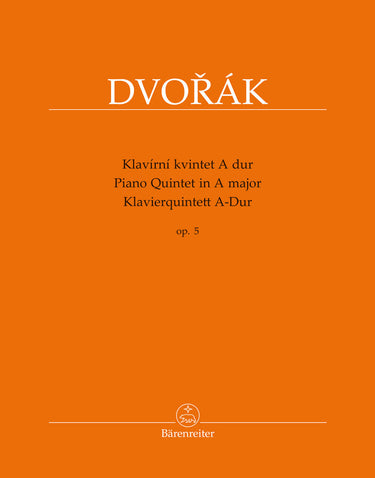 **Title**: Piano Quintet in A major op. 5 | **Comments**: Replaces H 2783 | **Composer / Author**: Dvorak, Antonin | **Editor**: Burghauser, Jarmil / Šolc, Karel | **Preface**: Beveridge, David R. | **Edition Type**: Performance score, Set of parts | **Instrumentation**: Piano quintet | **Scoring/ Instrumentation**: Piano, Violins (2), Viola, Violoncello | **Binding**: Paperback | **Level of Difficulty**: 3.0 | **Duration**: 00:28:00 | **Printing**: 1st printing 2017 | **Weight**: 522.0 g | **Format**: 31,0 x 24,3 cm | **Pages**: XIII, 63/8/8/8/8 S. | **Language**: EN | Sample: https://data.baerenreiter.com/NB/BA/BA11539_00_9790260108035_nb_lrg_01.jpg