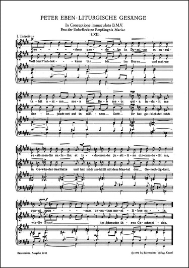 **Title**: In Conceptione immaculate B.M.V.- Proprium zum Fest der unbefleckten Empfängnis Mariae: Gaudens gaudeo / Voll des Frohlockens bin ich | **Subtitle**: Liturgische Gesänge 1. Einstimmiger Chor (auch im Wechsel mit Solostimmen) und Orgel | **Composer / Author**: Eben, Petr | **Edition Type**: Choral score | **Instrumentation**: Choir, Organ | **Scoring/ Instrumentation**: Choir, Organ | **Binding**: Stapled | **Level of Difficulty**: 3.0 | **Printing**: 3. Aufl. 2010 | **Language of Text Part**: Latin, German | **Weight**: 18.0 g | **Format**: 27,0 x 19,0 cm | **Pages**: 7 S. | **Language**: EN | Sample: https://data.baerenreiter.com/NB/BA/BA06251_00_9790006477517_nb_lrg_01.jpg