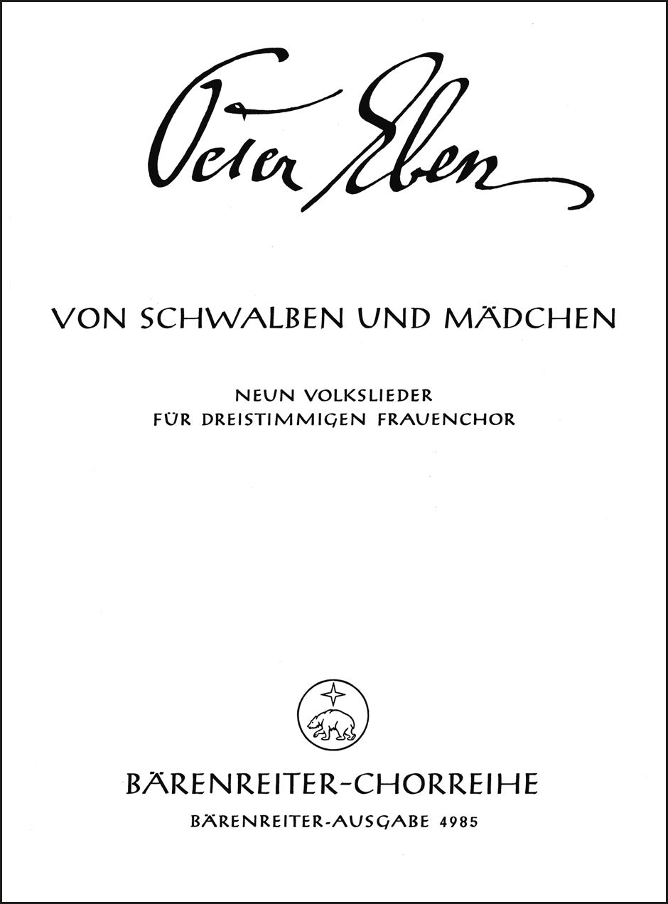 **Title**: Von Schwalben und Mädchen | **Subtitle**: 9 Czech folksongs | **Composer / Author**: Eben, Petr | **Edition Type**: Choral score, Anthology | **Instrumentation**: Female choir | **Scoring/ Instrumentation**: Female choir: SMezA | **Binding**: Stapled | **Level of Difficulty**: 4.0 | **Language of Text Part**: German | **Weight**: 63.0 g | **Format**: 29,8 x 21,0 cm | **Pages**: 20 S. | **Language**: EN | Sample: https://data.baerenreiter.com/NB/BA/BA04985_00_9790006461158_nb_lrg_01.jpg
