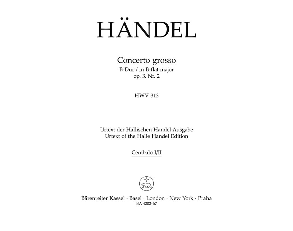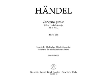 **Title**: Concerto grosso B-Dur op. 3/2 HWV 313 | **Composer / Author**: Handel, George Frideric | **Editor**: Hudson, Frederick | **Edition Type**: Part, Urtext edition | **Scoring/ Instrumentation**: 1. Harpsichord, 2. Harpsichord | **Binding**: Stapled | **Weight**: 58.0 g | **Format**: 24,0 x 30,5 cm | **Pages**: 15 S. | **Language**: EN | Sample: https://data.baerenreiter.com/NB/BA/BA04202_67_9790006444908_nb_lrg_01.jpg