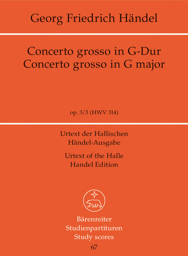 **Title**: Concerto grosso G-Dur op. 3/3 HWV 314 | **Composer / Author**: Handel, George Frideric | **Editor**: Hudson, Frederick | **Edition Type**: Study score, Urtext edition | **Instrumentation**: Orchestra | **Binding**: Stapled | **Weight**: 54.0 g | **Format**: 22,5 x 16,5 cm | **Pages**: VI, 17 S. | **Language**: EN | Sample: https://data.baerenreiter.com/NB/TP/TP00067_00_9790006200559_nb_lrg_01.jpg