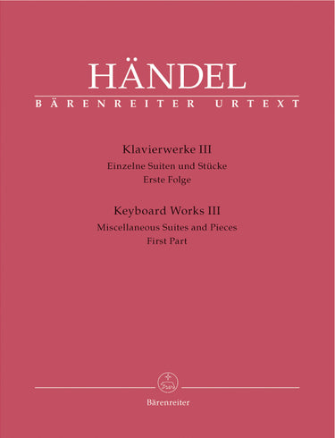 **Title**: Keyboard Works, Volume 3 | **Subtitle**: Miscellaneous Suites and Pieces. First Part | **Composer / Author**: Handel, George Frideric | **Editor**: Best, Terence | **Edition Type**: Performance score, Anthology, Urtext edition | **Instrumentation**: Piano | **Scoring/ Instrumentation**: Piano | **Binding**: Paperback | **Level of Difficulty**: 4.0 | **Printing**: 9th printing 2022 | **Weight**: 405.0 g | **Format**: 31,0 x 24,3 cm | **Pages**: VIII, 85 S. | **Language**: EN | Sample: https://data.baerenreiter.com/NB/BA/BA04222_00_9790006446223_nb_lrg_01.jpg