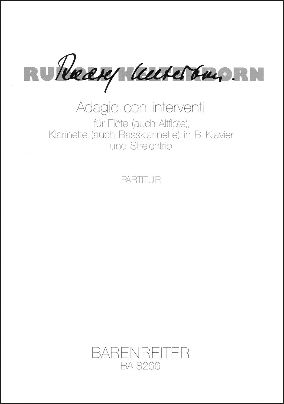 **Title**: Adagio con interventi für Flöte (auch Altflöte), Klarinette (auch Bassklarinette) in B, Klavier und Streichtrio (2000) | **Comments**: Uraufführung 12.02.2001, Zürich | **Composer / Author**: Kelterborn, Rudolf | **Edition Type**: Score | **Scoring/ Instrumentation**: Ensemble | **Binding**: Stapled | **Duration**: 00:16:00 | **Printing**: 3. Aufl. 2007 | **Weight**: 158.0 g | **Format**: 36,1 x 25,6 cm | **Pages**: 26 S. | **Language**: EN | Sample: https://data.baerenreiter.com/NB/BA/BA08266_00_9790006507337_nb_lrg_01.jpg
