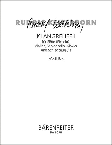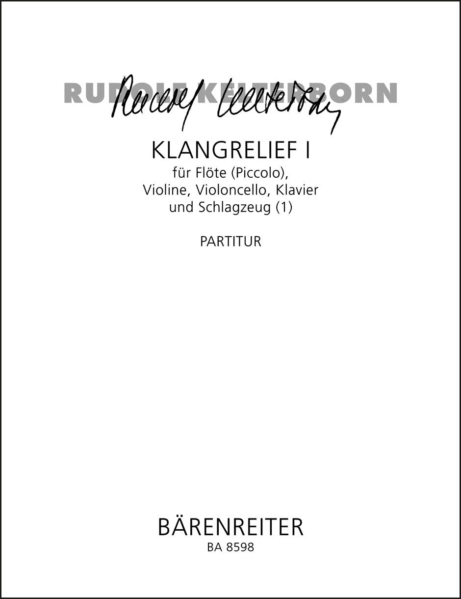 **Title**: Klangrelief I für Flöte (Piccolo), Violine, Violoncello, Klavier und Schlagzeug (1) (2000/2001) | **Comments**: Uraufführung 28.05.2001, Karlsruhe | **Composer / Author**: Kelterborn, Rudolf | **Edition Type**: Score | **Scoring/ Instrumentation**: Ensemble | **Binding**: Stapled | **Duration**: 00:12:00 | **Printing**: 3. Aufl. 2007 | **Weight**: 174.0 g | **Format**: 36,0 x 26,0 cm | **Pages**: 27 S. | **Language**: EN | Sample: https://data.baerenreiter.com/NB/BA/BA08598_00_9790006531066_nb_lrg_01.jpg