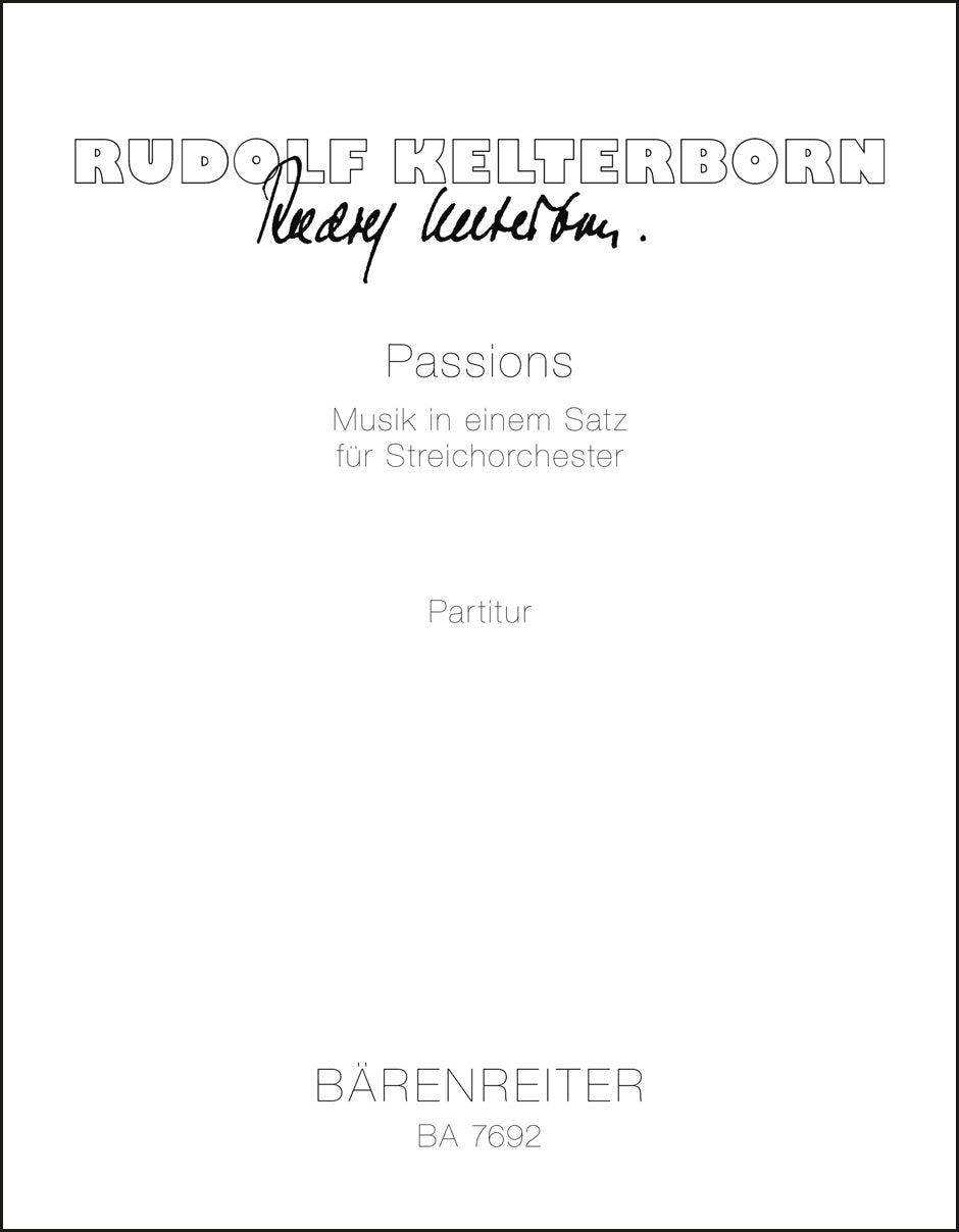**Title**: Passions (1998) | **Subtitle**: Musik in einem Satz für Streichorchester | **Comments**: Uraufführung 04.10.1999, Wien | **Composer / Author**: Kelterborn, Rudolf | **Edition Type**: Score | **Instrumentation**: String orchestra | **Scoring/ Instrumentation**: String orchestra | **Binding**: Stapled | **Duration**: 00:13:00 | **Weight**: 254.0 g | **Format**: 36,1 x 28,1 cm | **Pages**: 47 S. | **Language**: EN | Sample: https://data.baerenreiter.com/NB/BA/BA07692_00_9790006507368_nb_lrg_01.jpg