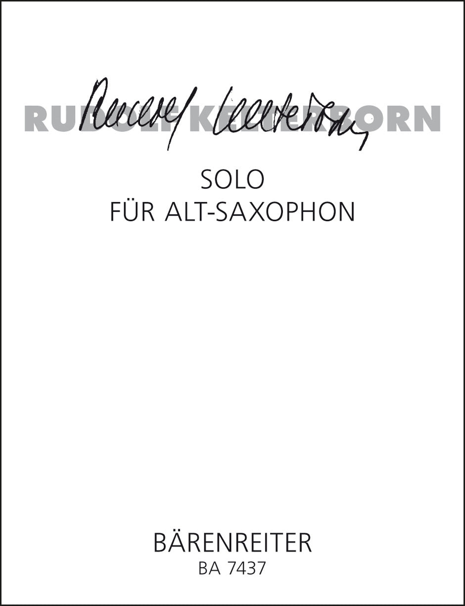 **Title**: Solo für Alt-Saxophon (1994/1995) | **Comments**: Uraufführung 1995, Genf | **Composer / Author**: Kelterborn, Rudolf | **Edition Type**: Performance score | **Instrumentation**: Saxophone | **Scoring/ Instrumentation**: Alto saxophone | **Binding**: Stapled | **Duration**: 00:04:30 | **Weight**: 59.0 g | **Format**: 30,0 x 23,0 cm | **Pages**: 5 S. | **Language**: EN | Sample: https://data.baerenreiter.com/NB/BA/BA07437_00_9790006498369_nb_lrg_01.jpg
