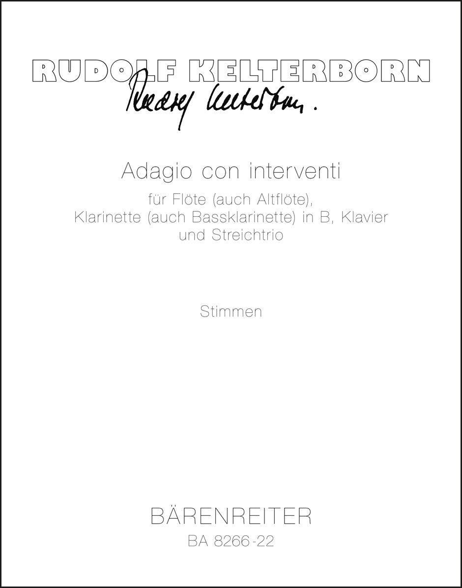 **Title**: Adagio con interventi für Flöte (auch Altflöte), Klarinette (auch Bassklarinette) in B, Klavier und Streichtrio (2000) | **Comments**: Uraufführung 12.02.2001, Zürich | **Composer / Author**: Kelterborn, Rudolf | **Edition Type**: Set of parts | **Scoring/ Instrumentation**: Flute, Alto flute, Clarinet, Bass clarinet, Piano, Violin, Viola, Violoncello | **Binding**: in a folder | **Duration**: 00:16:00 | **Printing**: 2001 | **Weight**: 297.0 g | **Format**: 35,0 x 27,5 cm | **Pages**: 6/5/9/6/5/5 S. | **Language**: EN | Sample: https://data.baerenreiter.com/NB/BA/BA08266_22_9790006507344_nb_lrg_01.jpg