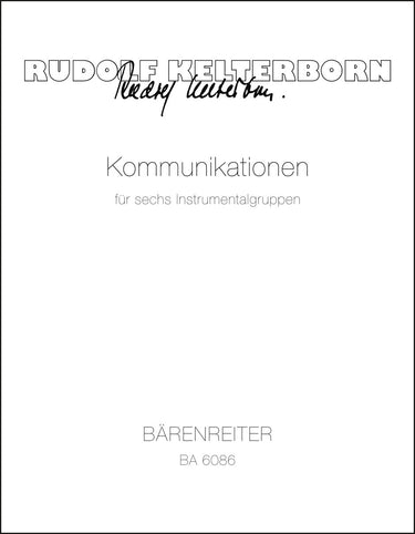 **Title**: Kommunikationen for Six Instrumental Groups (1971/1972) | **Comments**: World Premiere 15/08/1973, Lucerne | **Composer / Author**: Kelterborn, Rudolf | **Edition Type**: Study score | **Instrumentation**: Orchestra | **Binding**: Spiral stiched | **Duration**: 00:15:00 | **Weight**: 242.0 g | **Format**: 27,0 x 21,0 cm | **Pages**: 79 S. | **Language**: EN | Sample: https://data.baerenreiter.com/NB/BA/BA06086_00_9790006475452_nb_lrg_01.jpg