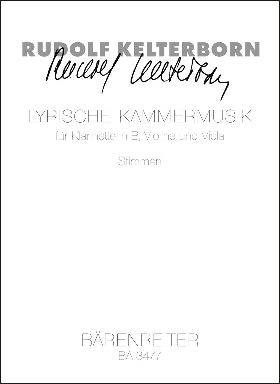 **Title**: Lyrische Kammermusik für Klarinette, Violine und Viola (1959) | **Comments**: Uraufführung 05/1960, Basel | **Composer / Author**: Kelterborn, Rudolf | **Edition Type**: Set of parts | **Instrumentation**: Clarinet, Violin, Viola | **Scoring/ Instrumentation**: Clarinet, Violin, Viola | **Binding**: Stapled | **Duration**: 00:11:00 | **Printing**: 3. Aufl. 2007 | **Weight**: 61.0 g | **Format**: 29,2 x 21,0 cm | **Pages**: 4/4/4 S. | **Language**: EN | Sample: https://data.baerenreiter.com/NB/BA/BA03477_00_9790006435692_nb_lrg_01.jpg