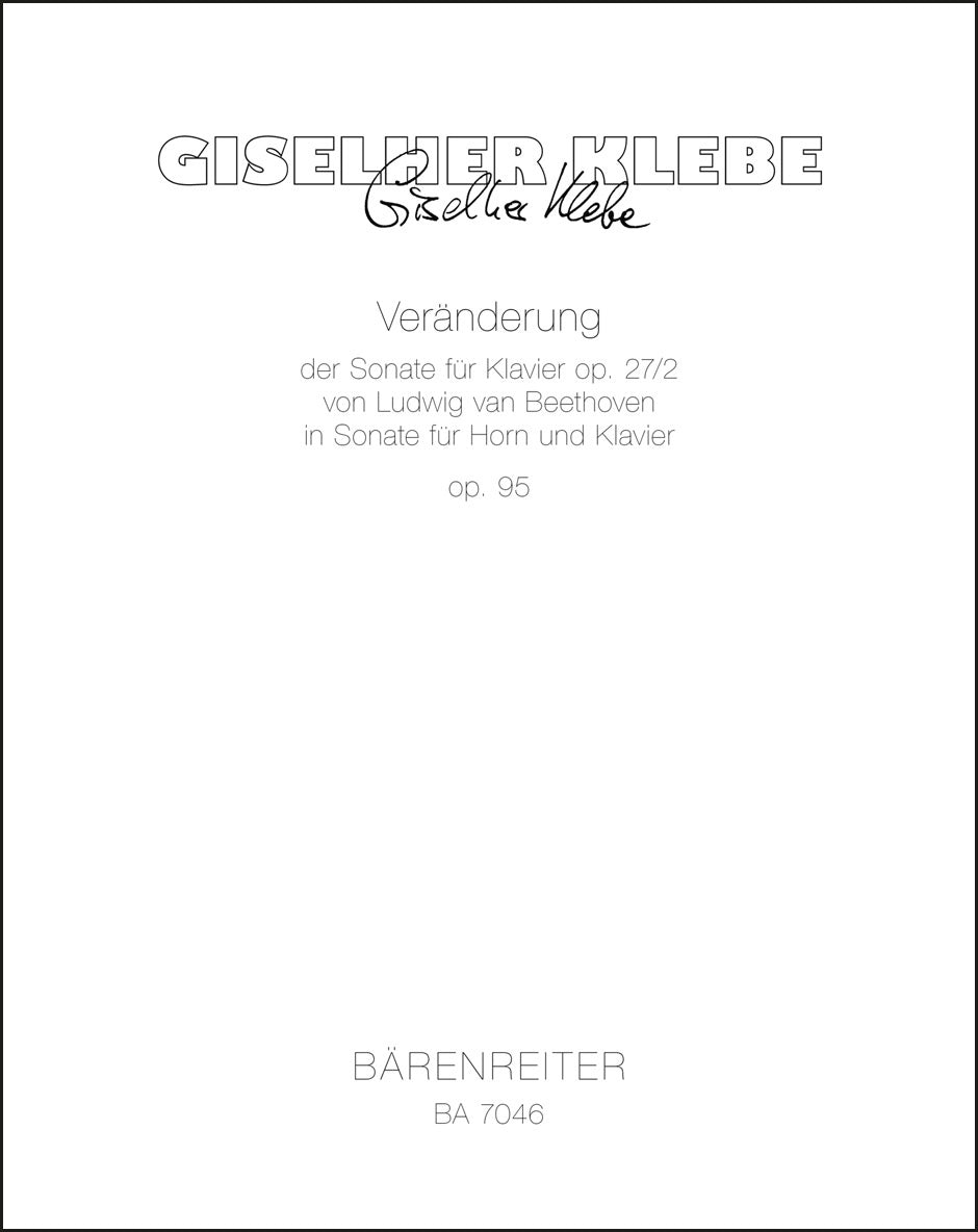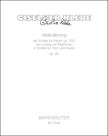 **Title**: Veränderung der Sonate für Klavier op. 27/2 von Ludwig van Beethoven in eine Sonate für Horn und Klavier op. 95 (1985/1986) | **Composer / Author**: Klebe, Giselher | **Edition Type**: Performance score, Part | **Instrumentation**: Horn, Piano | **Scoring/ Instrumentation**: Horn, Piano | **Binding**: Stapled | **Duration**: 00:15:00 | **Printing**: 8. Aufl. 2017 | **Weight**: 274.0 g | **Format**: 34,0 x 27,5 cm | **Pages**: 45/7 S. | **Language**: EN | Sample: https://data.baerenreiter.com/NB/BA/BA07046_00_9790006484713_nb_lrg_01.jpg