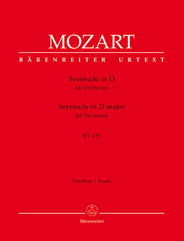 **Title**: Serenade in D major K. 239 | **Misc Information**: Serenata notturna | **Composer / Author**: Mozart, Wolfgang Amadeus | **Editor**: Haußwald, Günter | **Edition Type**: Score, Urtext edition | **Scoring/ Instrumentation**: Violin, String orchestra | **Binding**: Stapled | **Duration**: 00:18:00 | **Printing**: 14th printing 2021 | **Weight**: 131.0 g | **Format**: 31,0 x 24,3 cm | **Pages**: 24 S. | **Language**: EN | Sample: https://data.baerenreiter.com/NB/BA/BA05321_00_9790006467662_nb_lrg_01.jpg