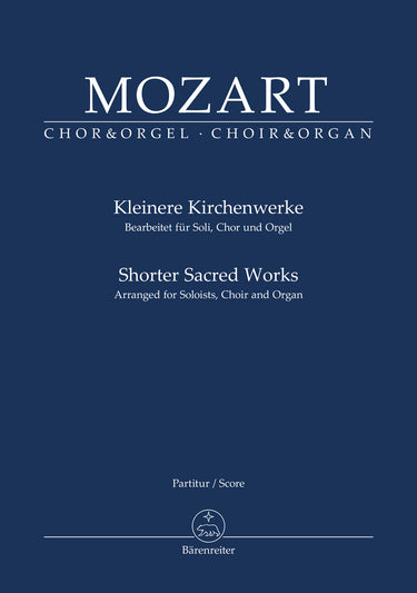 **Title**: Shorter Sacred Works | **Arranged for**: Arranged for Soloists, Choir and Organ | **Composer / Author**: Mozart, Wolfgang Amadeus | **Arranger**: Köhs, Andreas | **Edition Type**: Organ reduction | **Instrumentation**: Soloists, Choir, Organ | **Scoring/ Instrumentation**: Soloists, Mixed choir (SATB), Organ | **Binding**: Paperback | **Level of Difficulty**: 3.0 | **Printing**: 1st printing 2005 | **Weight**: 279.0 g | **Format**: 27,0 x 19,2 cm | **Pages**: 111 S. | **Language**: EN | Sample: https://data.baerenreiter.com/NB/BA/BA07523_00_9790006527977_nb_lrg_01.jpg