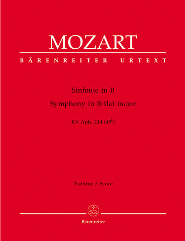 **Title**: Symphony in B-flat major K. Anh. 214 (45b) | **Composer / Author**: Mozart, Wolfgang Amadeus | **Editor**: Allroggen, Gerhard | **Edition Type**: Score, Urtext edition | **Instrumentation**: Orchestra | **Scoring/ Instrumentation**: Orchestra | **Binding**: Stapled | **Weight**: 84.0 g | **Format**: 30,0 x 23,0 cm | **Pages**: 14 S. | **Language**: EN | Sample: https://data.baerenreiter.com/NB/BA/BA09170_00_9790006528370_nb_lrg_01.jpg