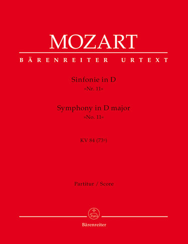 **Title**: Symphony no. 11 in D major K. 84 (73Q) | **Composer / Author**: Mozart, Wolfgang Amadeus | **Libretto/Text by**: Allroggen, Gerhard | **Editor**: Allroggen, Gerhard | **Edition Type**: Score, Urtext edition | **Instrumentation**: Chamber orchestra | **Scoring/ Instrumentation**: Orchestra | **Binding**: Stapled | **Duration**: 00:10:00 | **Printing**: 5th printing 2009 | **Weight**: 119.0 g | **Format**: 31,0 x 24,3 cm | **Pages**: 20 S. | **Language**: EN | Sample: https://data.baerenreiter.com/NB/BA/BA05375_00_9790006501403_nb_lrg_01.jpg