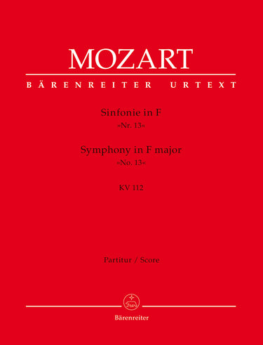 **Title**: Symphony no. 13 in F major K. 112 | **Composer / Author**: Mozart, Wolfgang Amadeus | **Editor**: Allroggen, Gerhard | **Preface**: Allroggen, Gerhard | **Edition Type**: Score, Urtext edition | **Instrumentation**: Chamber orchestra | **Scoring/ Instrumentation**: Orchestra | **Binding**: Stapled | **Duration**: 00:14:00 | **Printing**: 8th printing 2021 | **Weight**: 131.0 g | **Format**: 31,0 x 24,3 cm | **Pages**: 16 S. | **Language**: EN | Sample: https://data.baerenreiter.com/NB/BA/BA05360_00_9790006469178_nb_lrg_01.jpg
