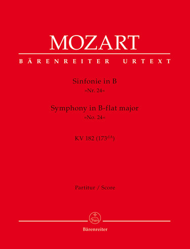 **Title**: Symphony no. 24 in B-flat major K. 182 (173dA) | **Composer / Author**: Mozart, Wolfgang Amadeus | **Editor**: Beck, Hermann | **Preface**: Beck, Hermann | **Edition Type**: Score, Urtext edition | **Instrumentation**: Orchestra | **Scoring/ Instrumentation**: Orchestra | **Binding**: Stapled | **Duration**: 00:10:00 | **Printing**: 7th printing 2023 | **Weight**: 101.0 g | **Format**: 31,0 x 24,3 cm | **Pages**: 14 S. | **Language**: EN | Sample: https://data.baerenreiter.com/NB/BA/BA04747_00_9790006455270_nb_lrg_01.jpg