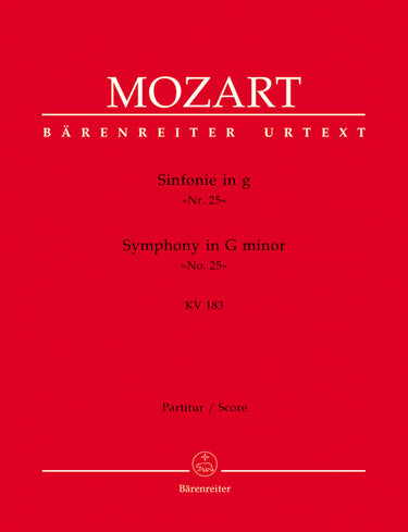 **Title**: Symphony no. 25 in G minor K. 183 | **Composer / Author**: Mozart, Wolfgang Amadeus | **Editor**: Beck, Hermann | **Edition Type**: Score, Urtext edition | **Scoring/ Instrumentation**: Orchestra | **Binding**: Stapled | **Duration**: 00:26:00 | **Printing**: 9th printing 2024 | **Weight**: 133.0 g | **Format**: 31,0 x 24,3 cm | **Pages**: 22 S. | **Language**: EN | Sample: https://data.baerenreiter.com/NB/BA/BA04748_00_9790006455331_nb_lrg_01.jpg