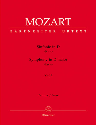 **Title**: Symphony no. 4 in D major K. 19 | **Composer / Author**: Mozart, Wolfgang Amadeus | **Editor**: Allroggen, Gerhard | **Edition Type**: Score, Urtext edition | **Instrumentation**: Orchestra | **Scoring/ Instrumentation**: Orchestra | **Binding**: Stapled | **Weight**: 84.0 g | **Format**: 30,0 x 23,0 cm | **Pages**: 14 S. | **Language**: EN | Sample: https://data.baerenreiter.com/NB/BA/BA09166_00_9790006528073_nb_lrg_01.jpg